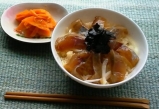 2器にごはんを盛りつけ、玉ねぎを散らし、漬けておいたわかしをのせる。中央に手でちぎった焼のりをのせて出来上がり。