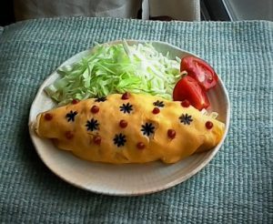 3おフライパンにお皿をかぶせてオムライスをうつし、ぬれ布巾で形を整える。型で抜いておいた焼のりとケチャップで可愛くプチデコして出来上がり。