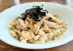 3、器に2の具を混ぜたうどんを盛り付け、味えのきをのせ、手で揉んだ焼のりをかけて出来上がり。