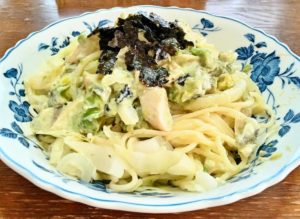 《材料》1乾パスタ30g-2アボカド(角切り)60g-3自家製ささみハム(短冊切)1本-4玉ねぎ(細くし切)70g-5キャベツ30g-6マヨネーズ小さじ1杯-7ヨーグルト(豆乳+牛乳)50g-8塩少々-9焼のり全形1/2枚