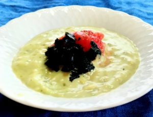 《材料》1アボカド50g-2豆乳ヨーグルト50g-3だし顆粒少々-4カットトマト10g-5塩少々-6焼のり全形1/4枚