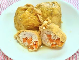 2、容器に豆腐と人参を混ぜ、1の油揚げに詰め、豚肉を20gずつ加え、パスタで口を閉じる。