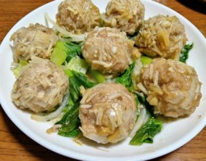 《材料》1牛豚合挽き肉50g-2鶏ひき肉50g-3椎茸(粗みじん切り)1個-4えのきたけ(長さ8mm )1/3束-5玉ねぎ(粗みじん切り)30g-6砂糖小さじ1杯-7塩1g-8片栗粉適量*つけ合わせ:もやし-チンゲン菜