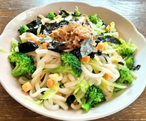《材料》1ゆでうどん1袋-2キャベツ(粗線切り)120g-3ブロッコリー60g-4自家製ささみハム1本-5チーズ30g-6焼のり全形1/2枚