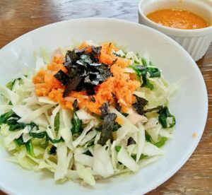 2、器にキャベツ、ささみハム、1のほうれん草を入れて混ぜ、人参ドレッシングをかける。