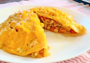 2、卵を割りほぐし、塩と砂糖を加えて半熟状に焼く。
