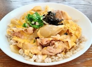 〈材料〉1ゆで押し麦80g-2豚薄切り肉60g-3玉ねぎ(くし切り)50g-4卵1個-5#和風だし適量-6料理酒大さじ2杯-7大根茎葉適宜-8焼のり全形1/4枚