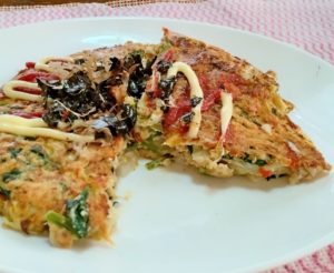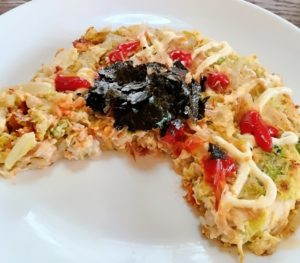 3、器に焼いた2のお好み焼きをのせて、ケチャップ、マヨネーズをかけて、かつお節、手で揉んだ焼のりをかけて出来上がり。