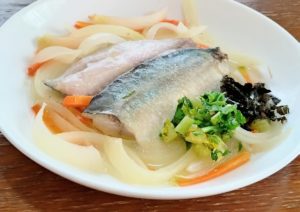 〈材料〉1鯵1尾-2玉ねぎ(くし切り)30g-3人参(せん切り)20g-4白ワイン100cc-5オリーブ油大さじ1杯-6塩少々-7焼のり全形1/4枚-8大根茎葉