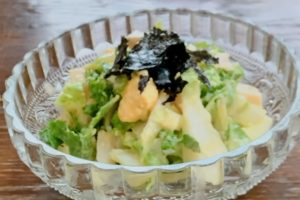 〈材料〉1白菜(5mm幅短冊切)80g-2自家製ササミハム(角切)1本-3ゆで卵(粗みじん切)1個-4マヨネーズ小さじ2杯-5豆乳ヨーグルト大さじ1杯-6焼のり全形1/4枚