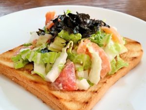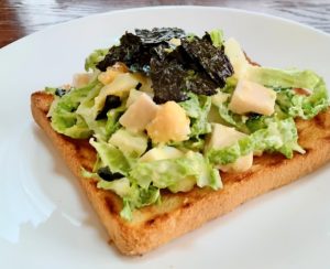 2、3/11に別途作成した白菜サラダを1でトーストしたパンにのせて出来上がり。