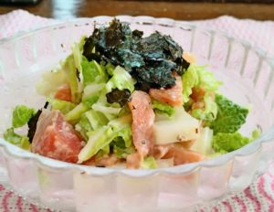 2、器に和えた1のサラダを盛り、手で揉んだ焼のりをのせて出来上がり。混ぜながらいただく。